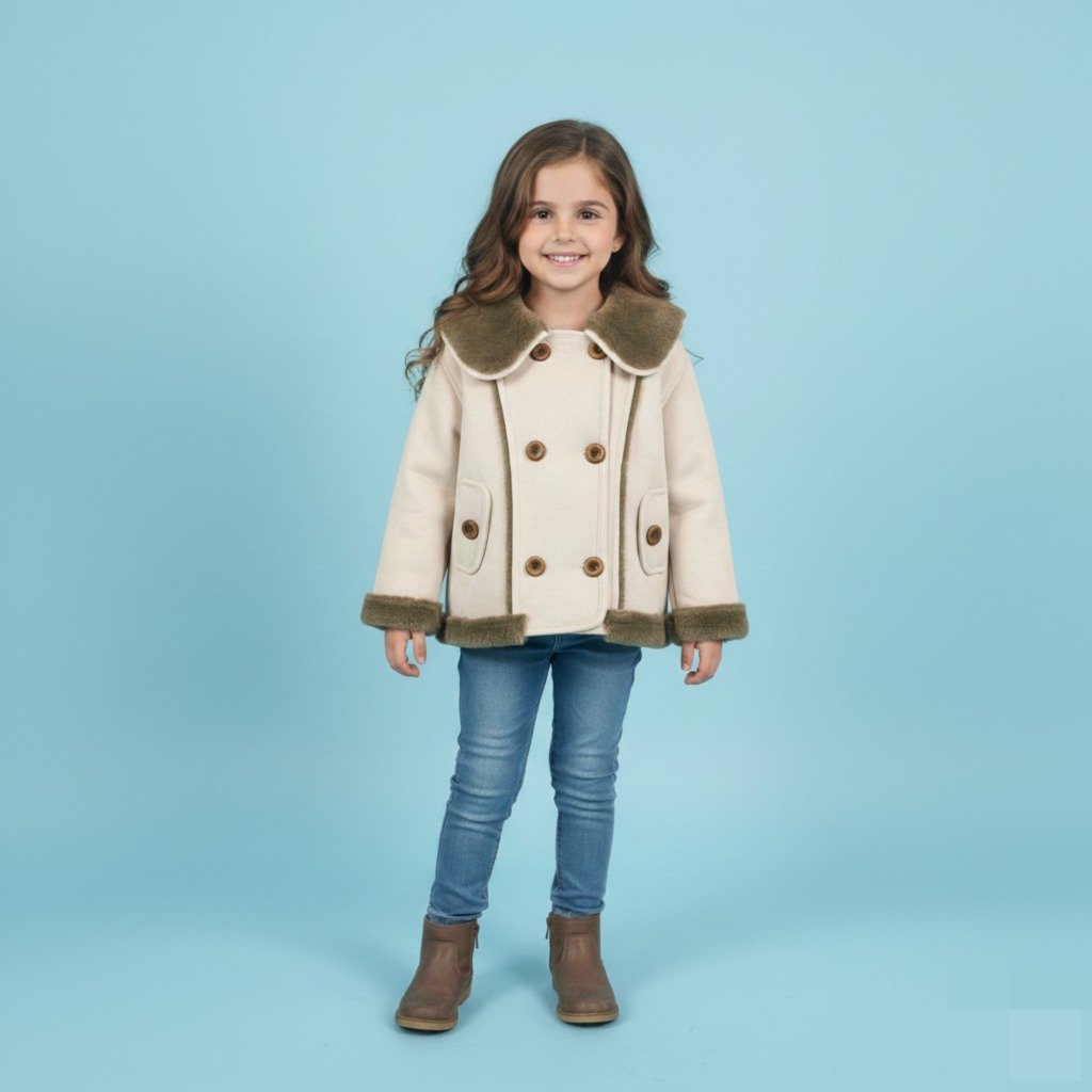A timeless and cozy outfit perfect for cool weather. The look features a cream-colored double-breasted coat with warm faux-fur trimming on the collar, cuffs, and hem, adding a touch of elegance and comfort. Wooden-style buttons and front pockets enhance the classic design. Paired with fitted blue jeans and brown ankle boots, this outfit creates a stylish yet practical winter ensemble ideal for outings, casual events, or everyday wear