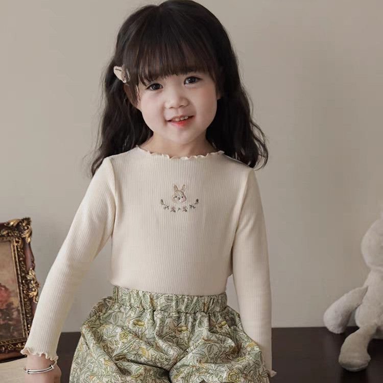 Add soft elegance to your little one’s wardrobe with this charming ribbed baby girl top in a soothing ivory cream shade. Made from gentle, stretchable ribbed fabric, it features a delicate bunny embroidery with tiny floral accents at the chest and sweet lettuce-edge finishing on the neckline, cuffs, and hem. Designed for comfort and style, this top is perfect for everyday wear or layering during cooler days.