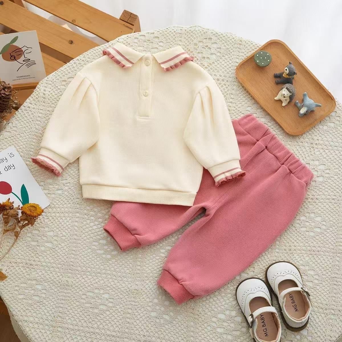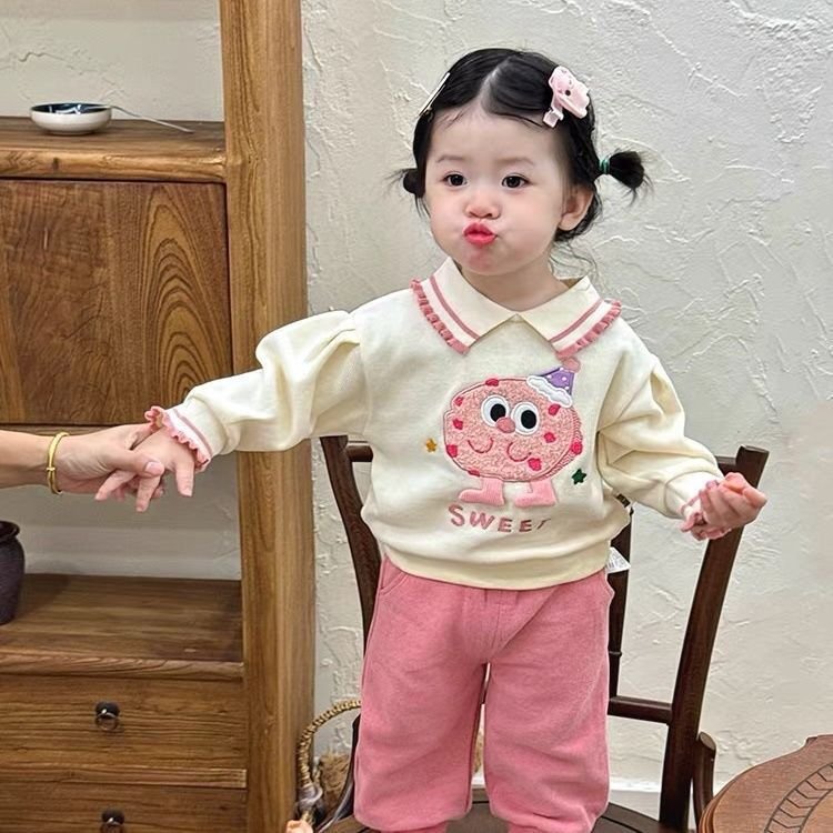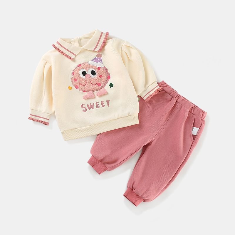 This adorable baby girl outfit set features a cozy long-sleeve top paired with matching soft pants, designed in sweet cream and dusty pink tones. The top is highlighted with a cute cupcake embroidery and “SWEET” lettering, finished with delicate ruffle details on the collar and cuffs for an extra charming touch. Made from soft, breathable fabric, this set ensures all-day comfort while keeping your little one stylish.