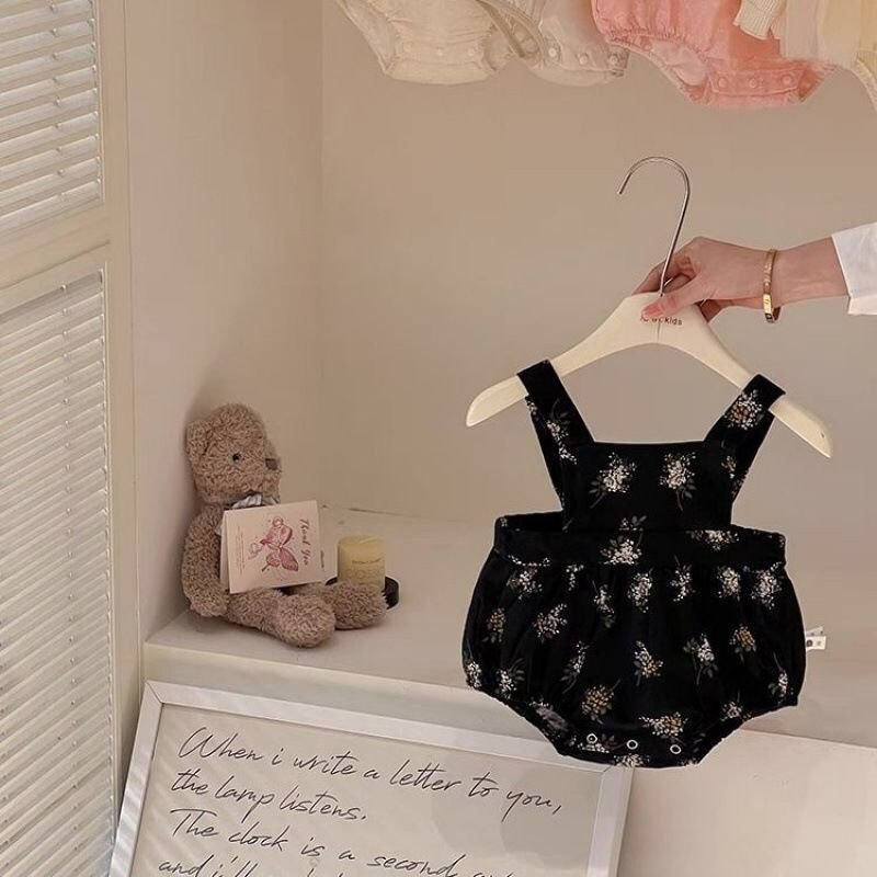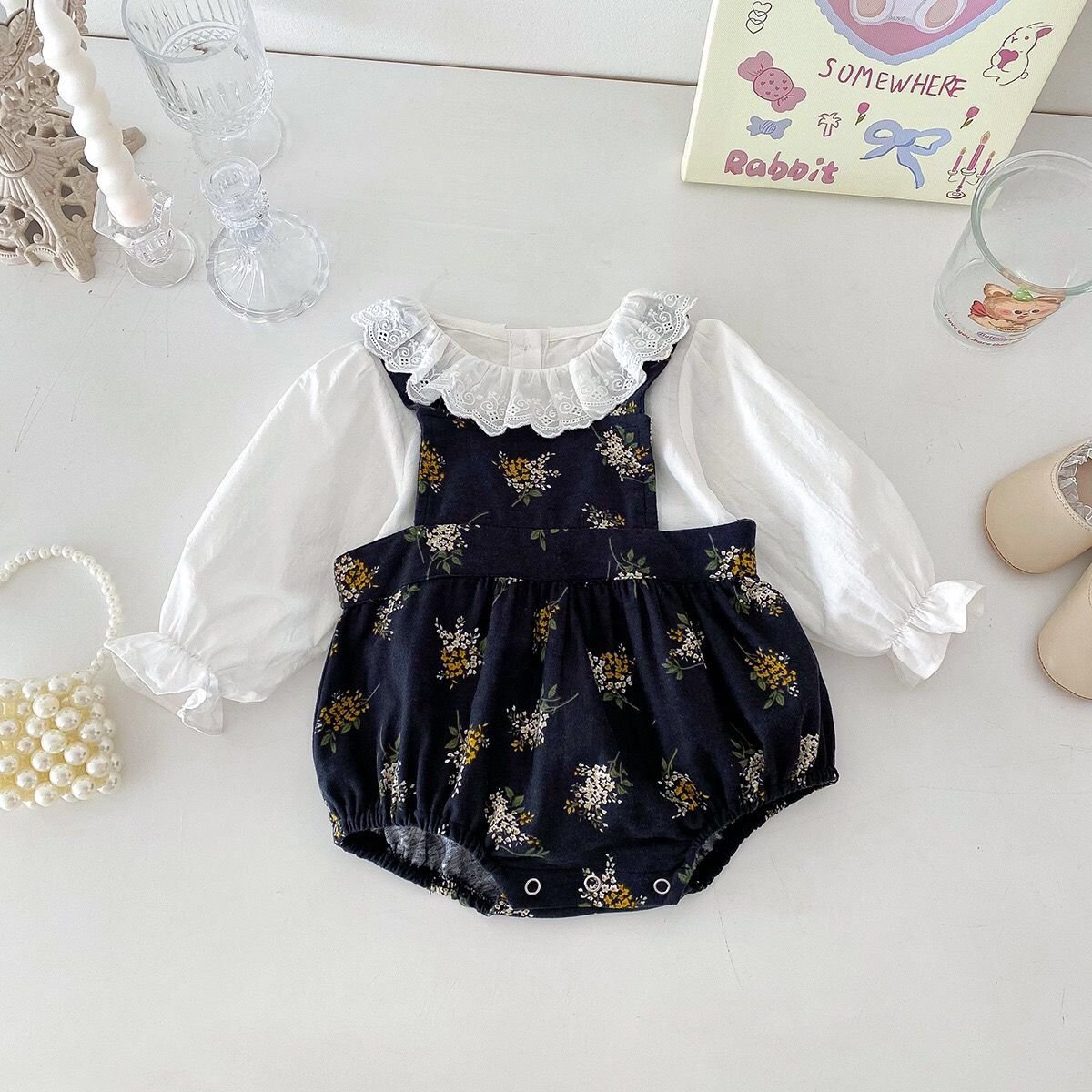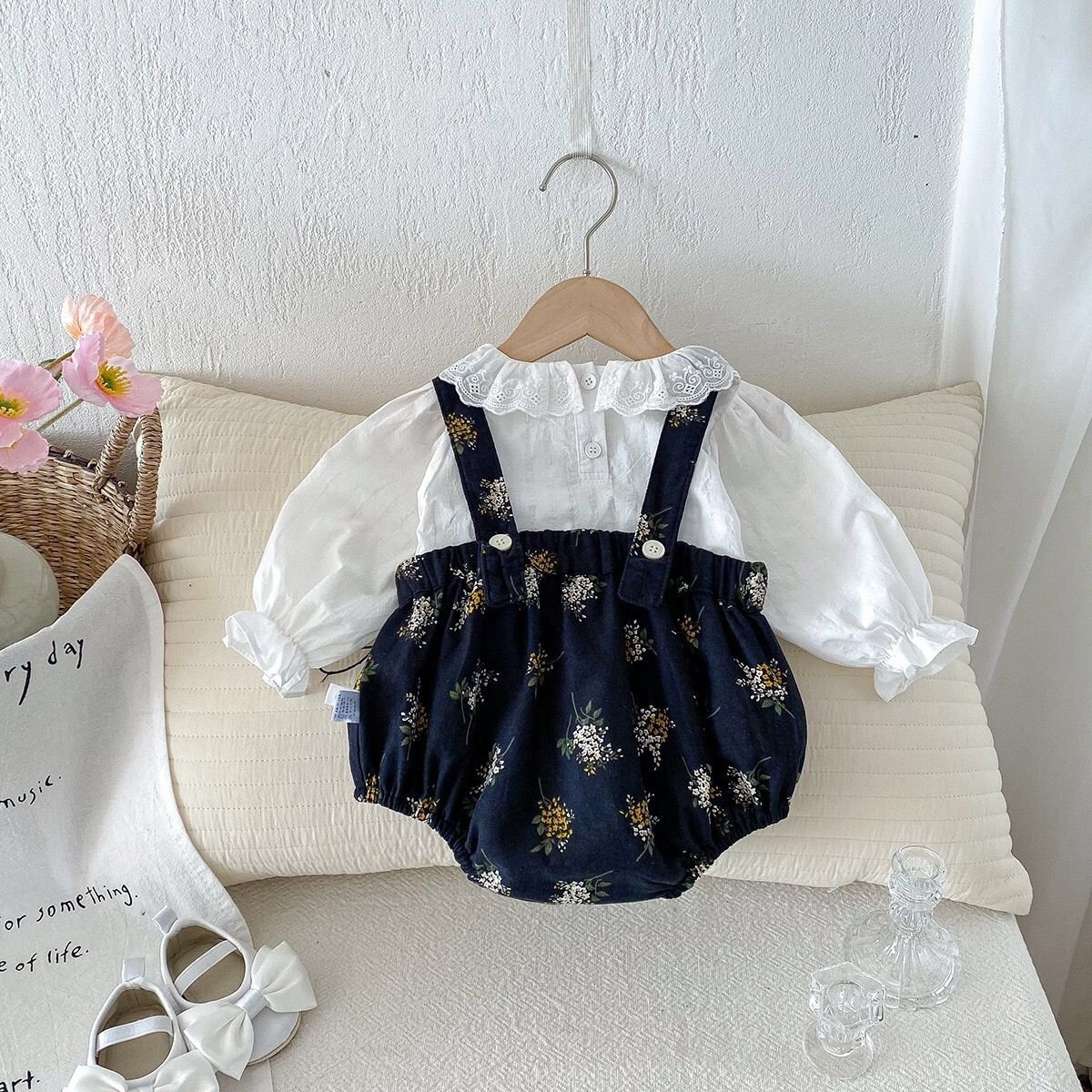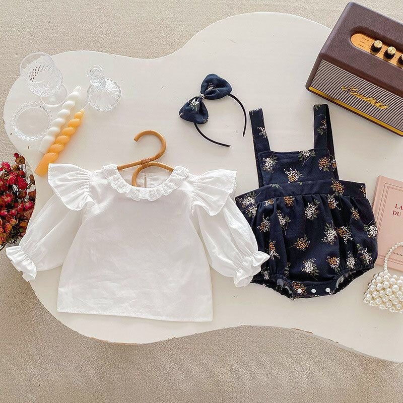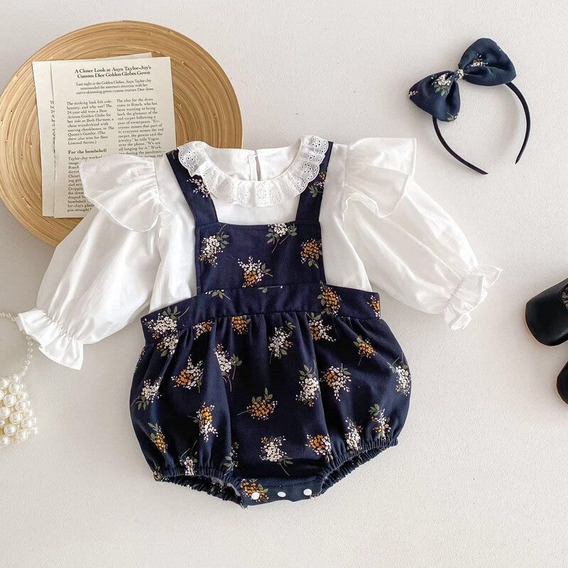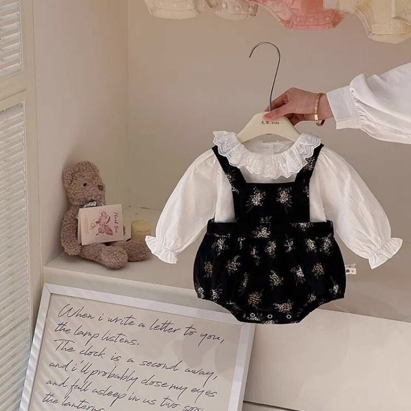The Classic Bloom Layered Baby Romper is a timeless and elegant outfit designed for special moments and everyday charm This beautiful piece features a soft white inner top with puffed sleeves and a delicate lace ruffled collar, paired with a black floral suspender-style romper for a classic layered look.