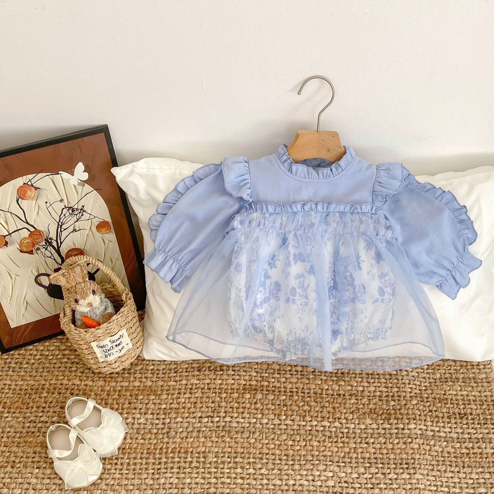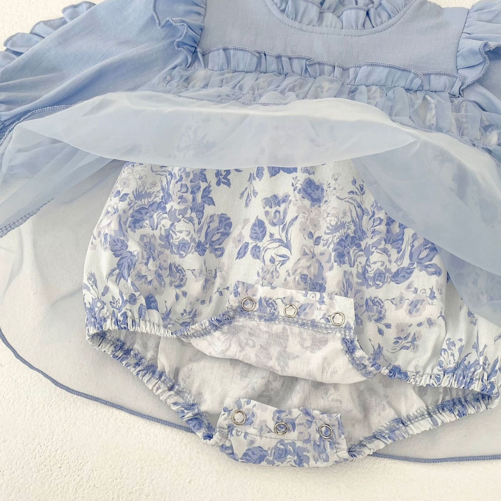 A dreamy and elegant PC set designed for little princess moments. This set features a soft pastel blue long-sleeve top with delicate ruffle details, paired with a floral inner romper and a sheer tulle overlay for a fairy-like finish. Light, breathable, and gentle on baby skin, it’s perfect for special occasions, photoshoots, or stylish everyday wear. Sweet, graceful, and timeless