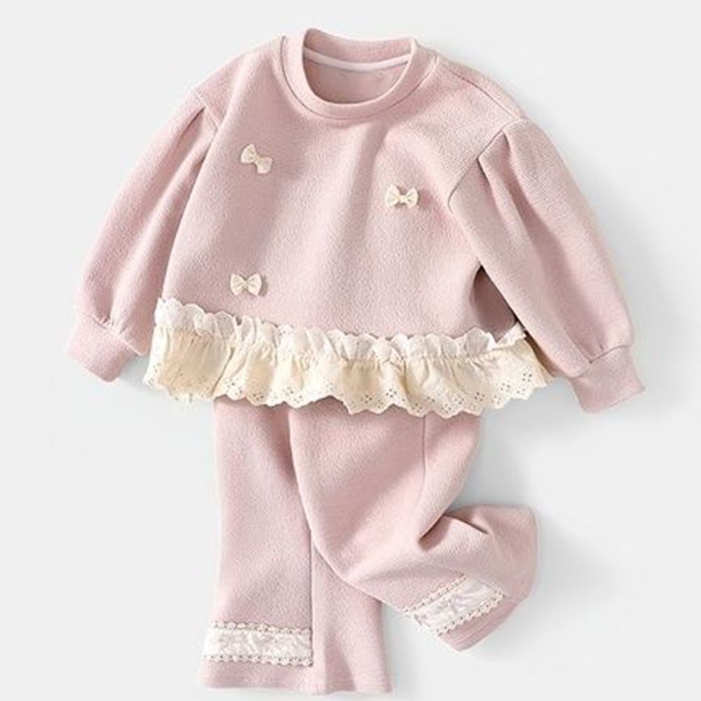 An adorable pastel pink co-ord set designed for effortless comfort and charm. The soft full-sleeve top features delicate bow appliqués and a pretty lace frill hem, paired with matching relaxed-fit pants finished with lace detailing. Crafted from cozy, skin-friendly fabric, this outfit is perfect for playtime, outings, or casual celebrations. A sweet blend of elegance and everyday comfort for little girls.