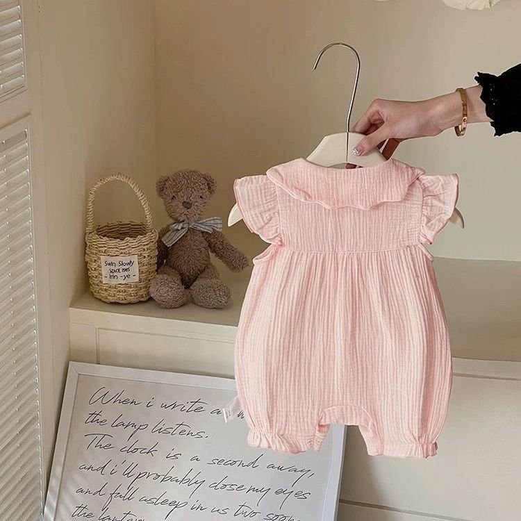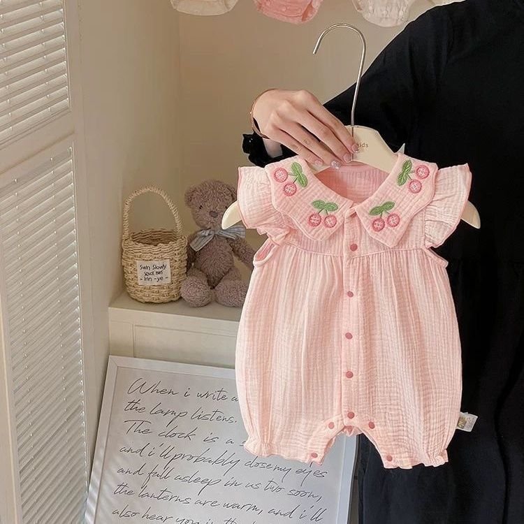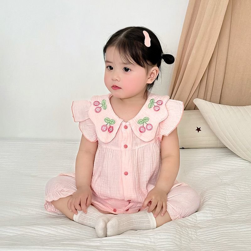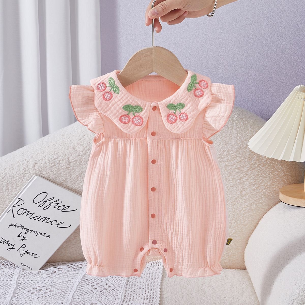A soft and airy blush-pink baby romper made from lightweight crinkled cotton for all-day comfort. It features a sweet ruffled collar embroidered with tiny cherry motifs, flutter sleeves, and delicate front buttons for easy dressing. Snap closures at the bottom make changes simple, while the gentle pastel tone and charming embroidery give it a fresh, innocent, and cozy look—perfect for warm days or adorable photos.