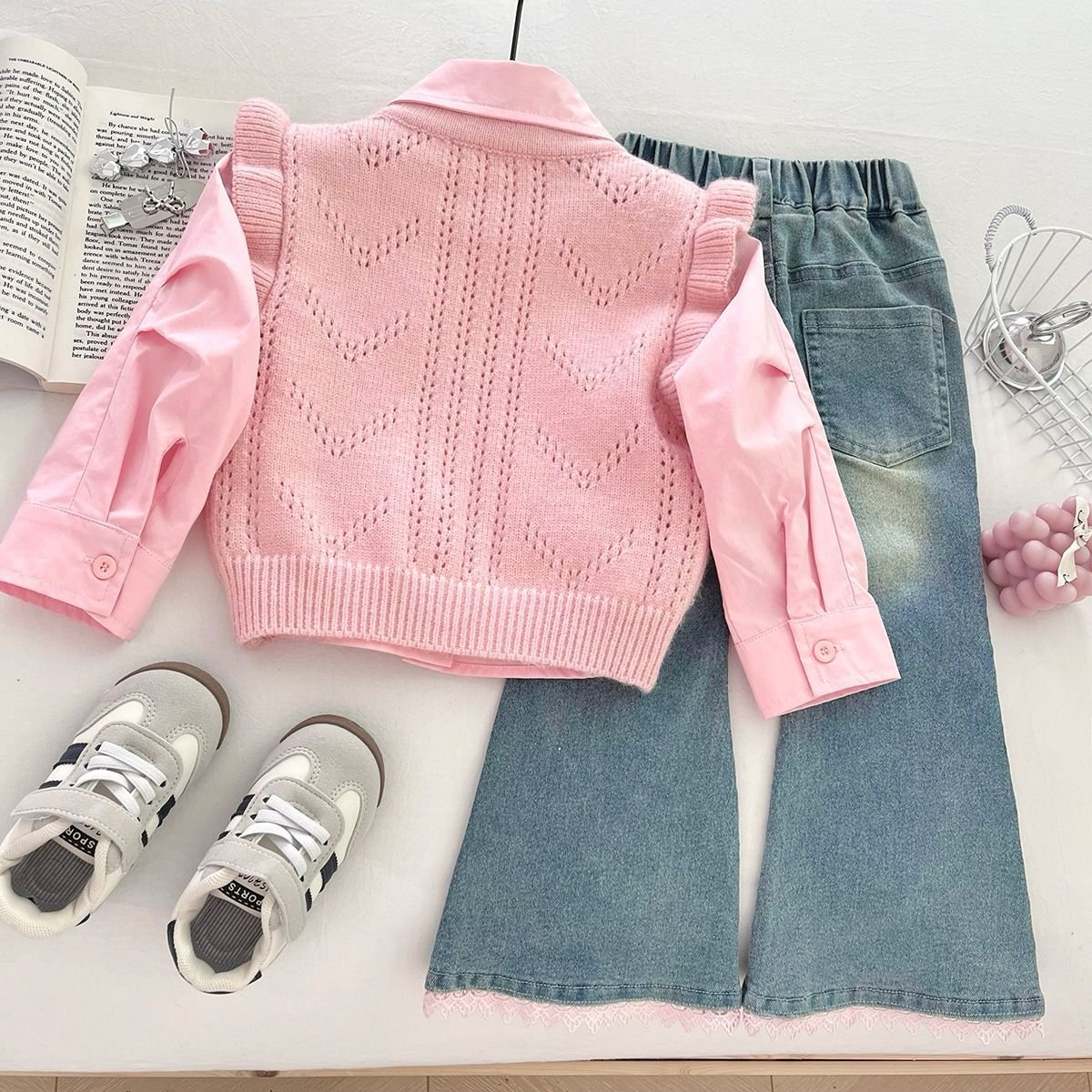 This adorable kids’ co-ord set features a soft blush pink knitted vest layered over a matching collared shirt with puffed sleeves, creating a sweet and elegant look. Delicate bow and floral appliqué details add a charming touch, while the breathable knit keeps it cozy and comfortable. Paired with stylish denim pants finished with lace-trim detailing at the hem, this outfit blends cuteness with everyday elegance—perfect for outings, casual parties, or special occasions.