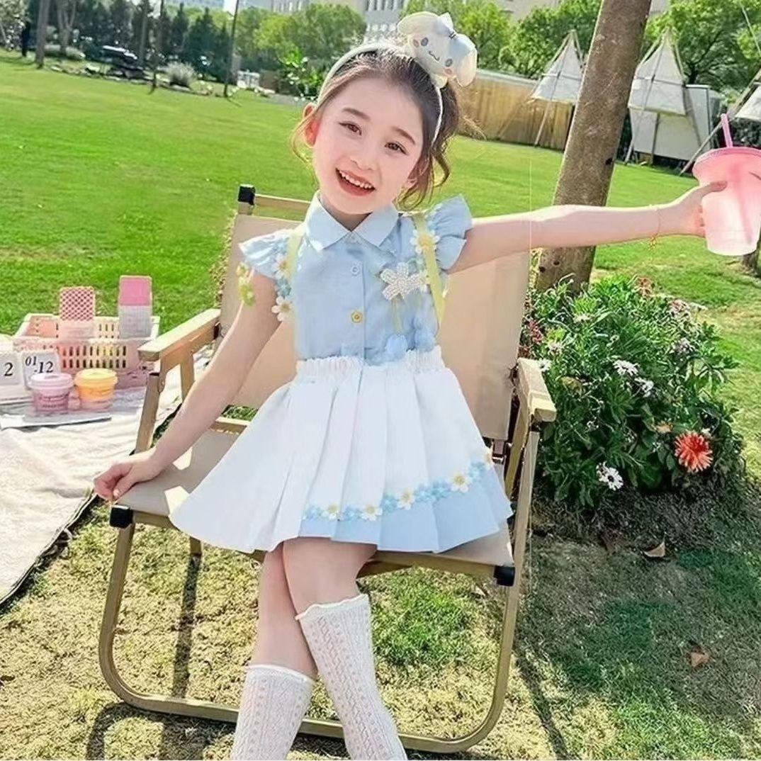 A charming pastel blue and white outfit designed with delicate daisy embellishments for a fresh, playful look. The sleeveless collared top features soft ruffle shoulders and floral detailing along the straps, highlighted with cute button accents and a decorative flower charm. Paired with a crisp white pleated skirt adorned with matching daisy appliqués, this set creates a sweet, airy silhouette—perfect for summer outings, birthdays, or special day events. Light, elegant, and irresistibly adorable.