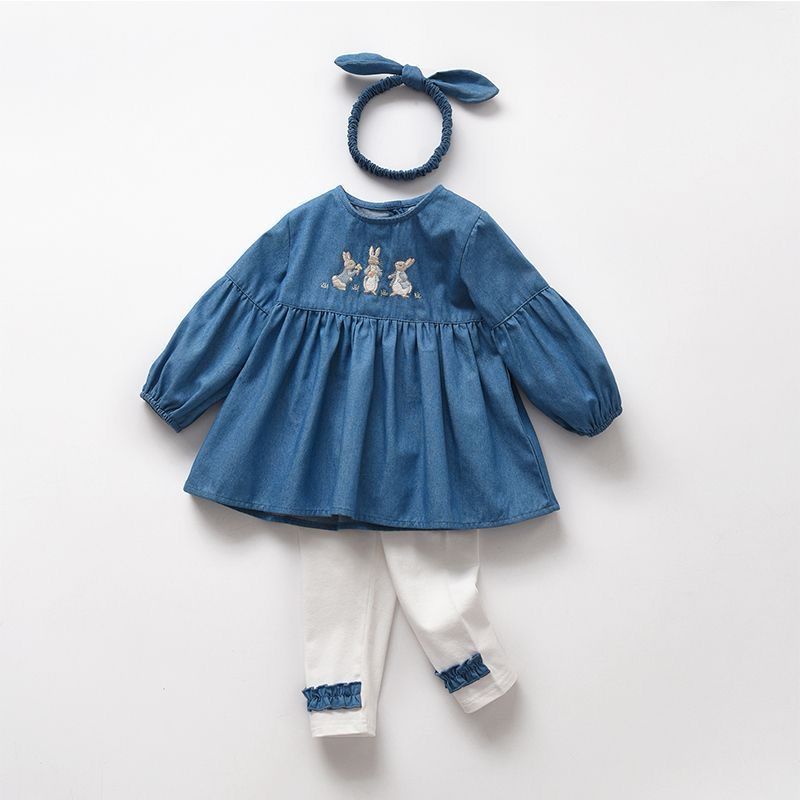 A sweet blue denim tunic with puff sleeves and cute bunny embroidery, paired with soft white leggings featuring matching denim ruffle cuffs and a bow headband. Cozy, playful, and perfect for everyday adventures or casual outings.