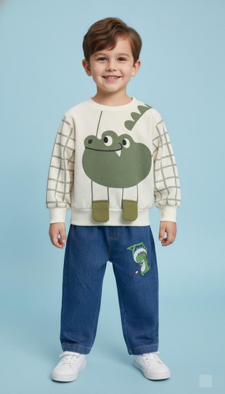 A fun and adventurous boys’ outfit perfect for playful days. The cream-colored sweatshirt features a cheerful cartoon dinosaur graphic with textured detailing, paired with patterned sleeves that add a modern twist. Matched with relaxed-fit blue jeans decorated with a cute dinosaur accent on the leg, this set brings character and charm together. it’s an ideal outfit for school, outings, or everyday adventures, combining comfort with a lovable dino theme.