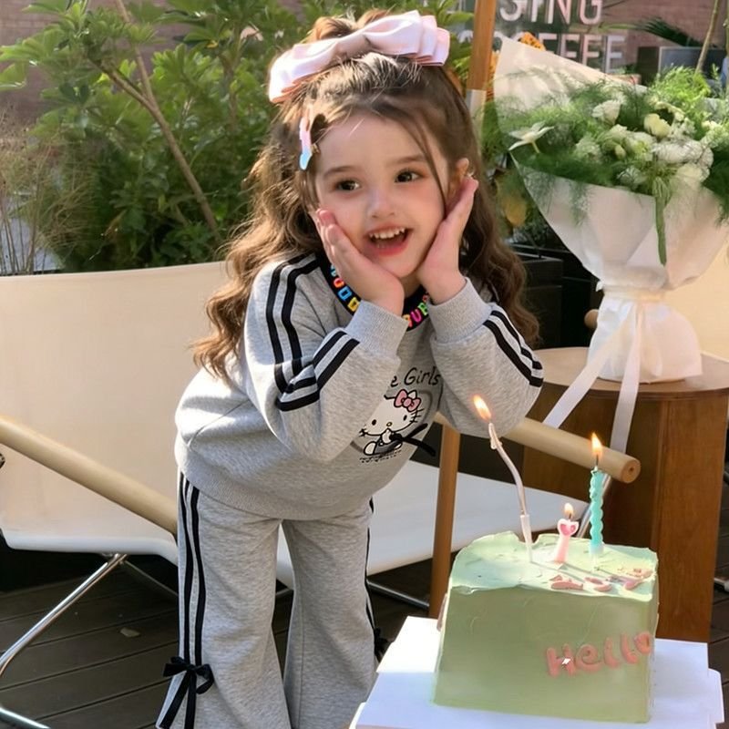 A delightful three-year-old girl models a cozy grey two-piece set featuring an all-over playful print and charming red accents. The zip-up hoodie is detailed with a cute bow at the front and a soft-lined hood, while the matching jogger pants offer a relaxed, comfortable fit with sweet bow ties at the sides. Styled with white sneakers and set against a clean, softly lit studio background, this professional photoshoot highlights a perfect blend of comfort and cuteness—ideal for everyday wear, playtime, and premium kidswear collections.