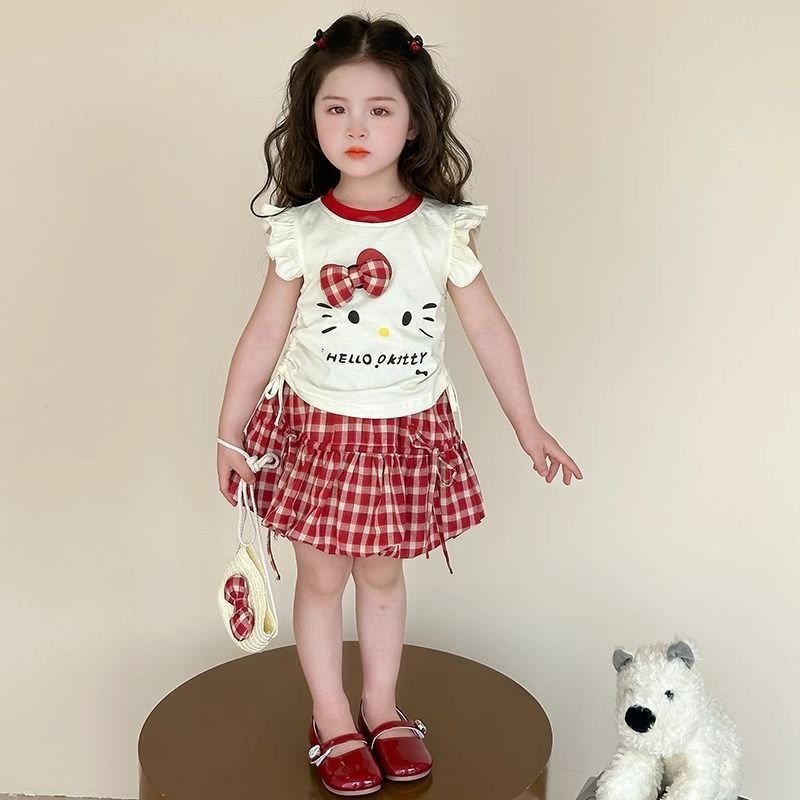 Dress your little one in timeless charm with this Baby Girl Red Checkered Dress Set, designed with a cute cartoon cat face print, gingham skirt, and matching accessories. The soft cream top features flutter sleeves, contrast red neckline, and an adorable bow detail that pairs beautifully with the classic red-and-white checkered skirt.