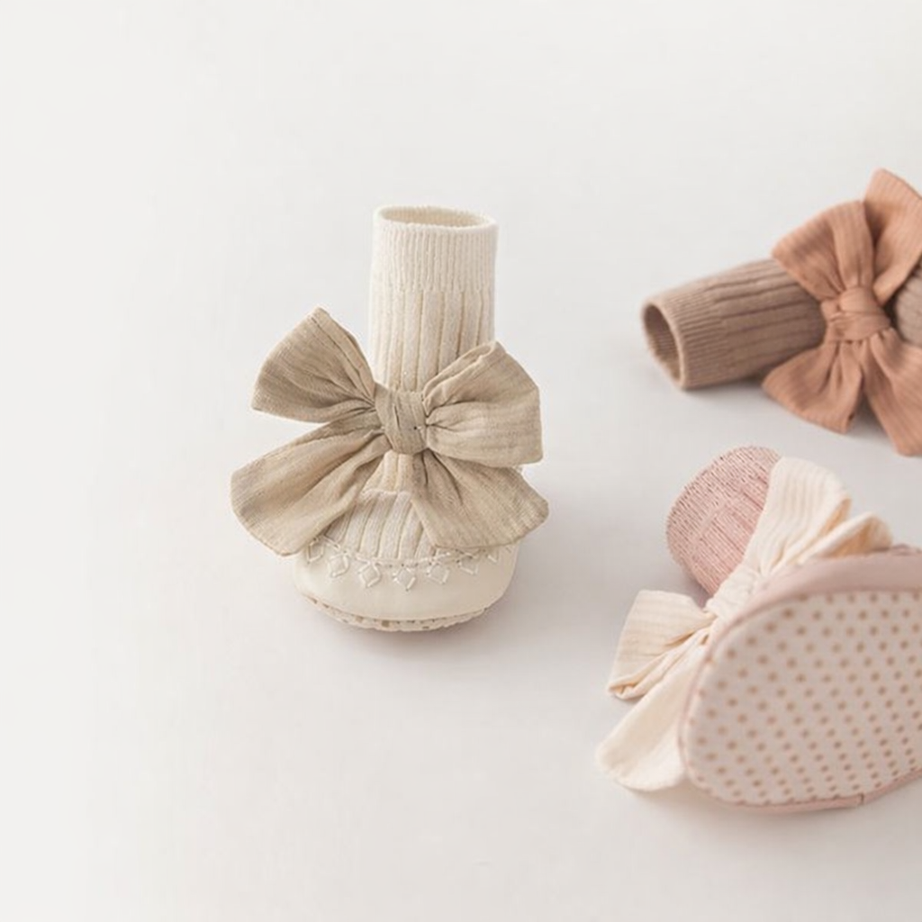 Sweet and elegant baby sock shoes in a soft ivory tone, designed with ribbed socks and charming fabric bows on top. Lightweight, cozy, and gentle on little feet—perfect for newborns, special occasions, photoshoots, or everyday cuteness