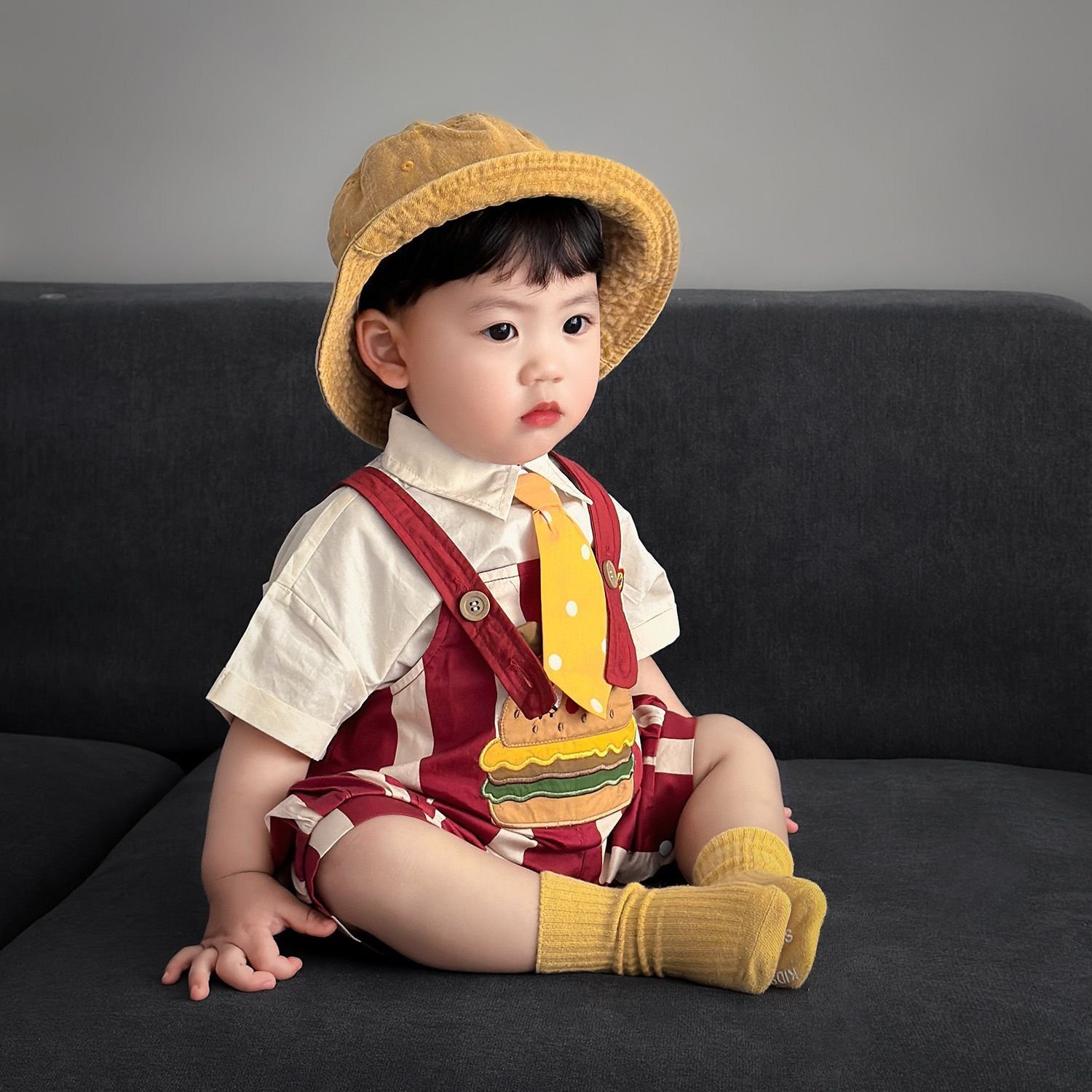 A retro‑cute look featuring a cream short‑sleeve shirt paired with red‑and‑white striped suspender shorts, finished with a fun burger applique at the front. A yellow polka‑dot tie, complete the playful “mini diner mascot” vibe—perfect for photoshoots and fun outings.