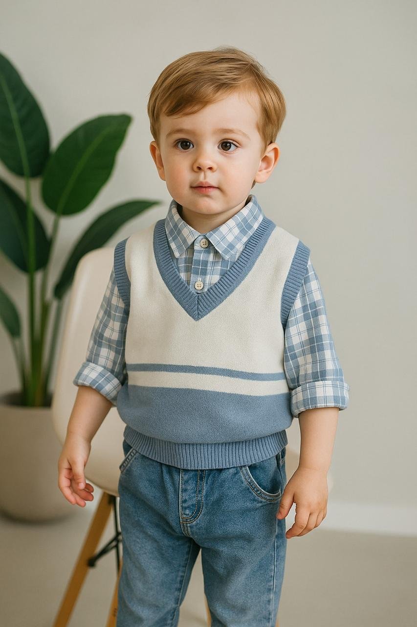 This smart and timeless kidswear look features a soft knit sleeveless vest in soothing blue and cream tones, layered over a checked button-down shirt. Paired with comfortable denim jeans, the outfit creates a polished yet playful style perfect for special occasions, family gatherings, or stylish everyday wear. Crafted from gentle, breathable fabrics, it ensures all-day comfort while giving a neat, classy appearance for little boys