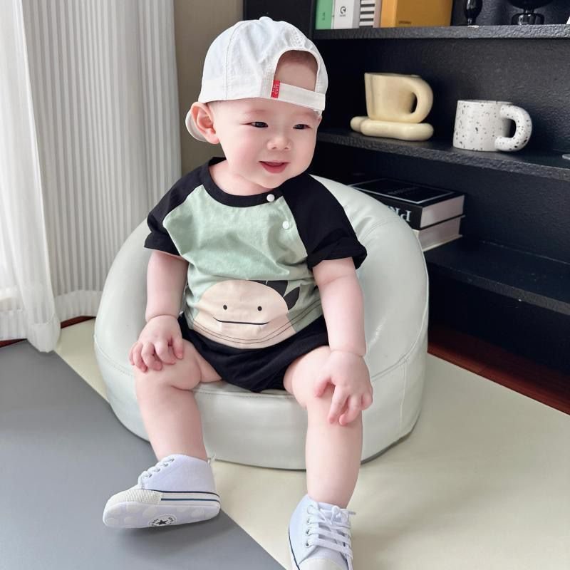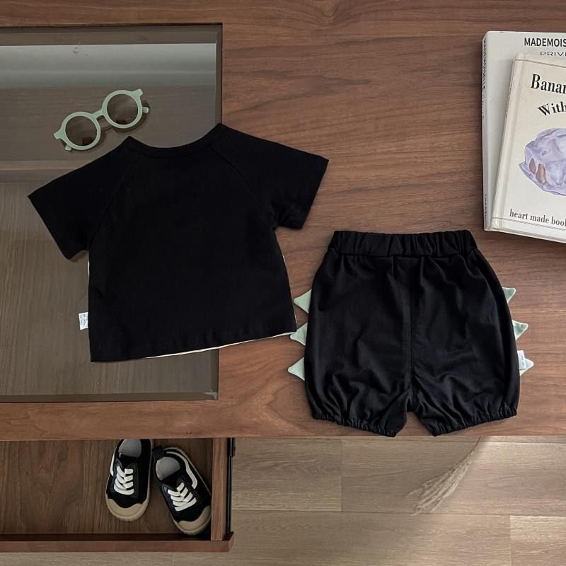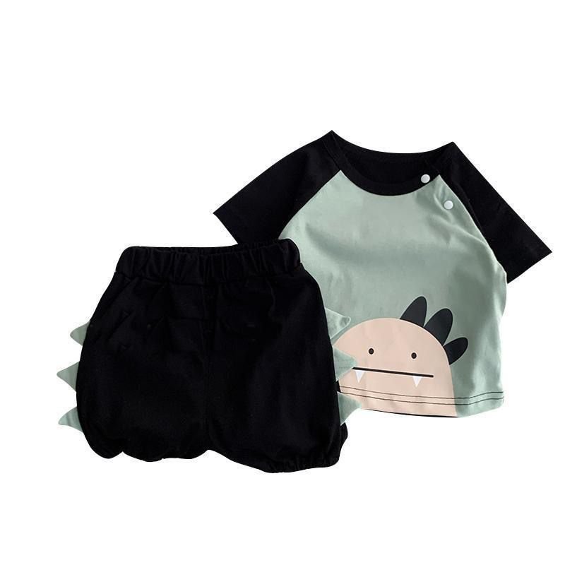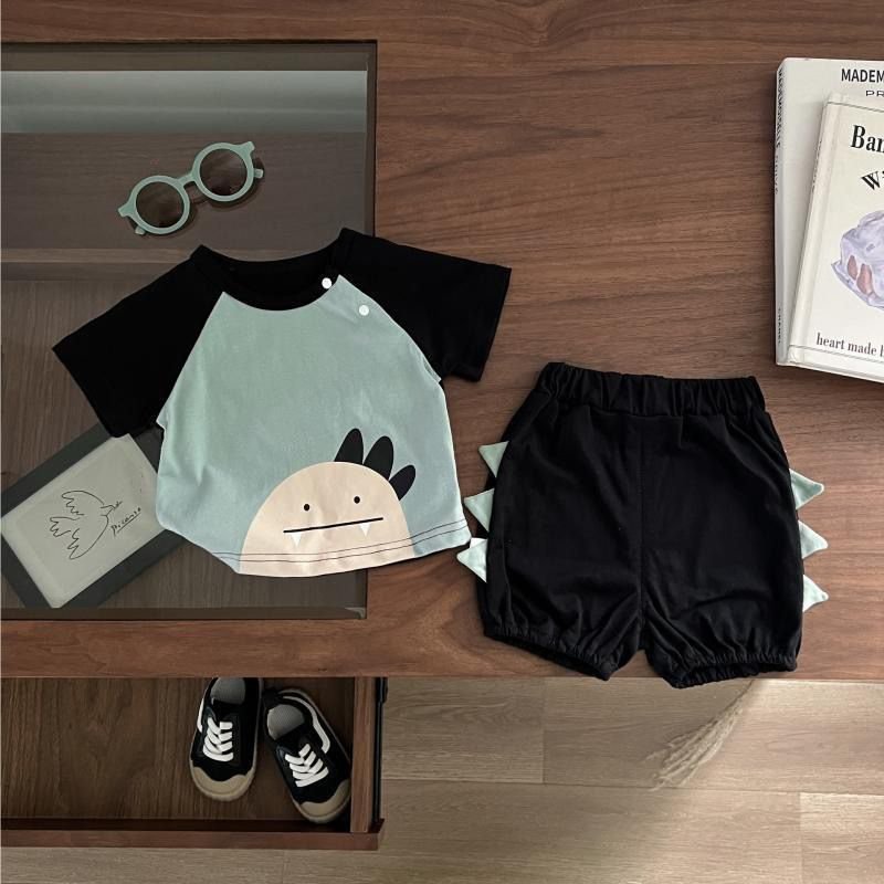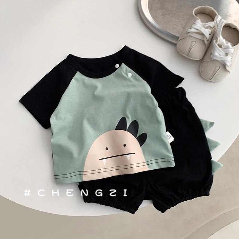 A super cute 2-piece outfit with a playful dinosaur theme . Comes with a short-sleeve snap-button top featuring a friendly dino face, paired with comfy bloomer shorts with adorable dino spikes at the back . Perfect for daily wear and crawling-friendly comfort.