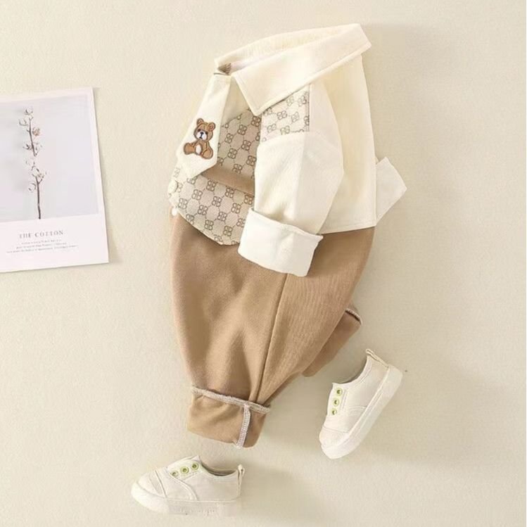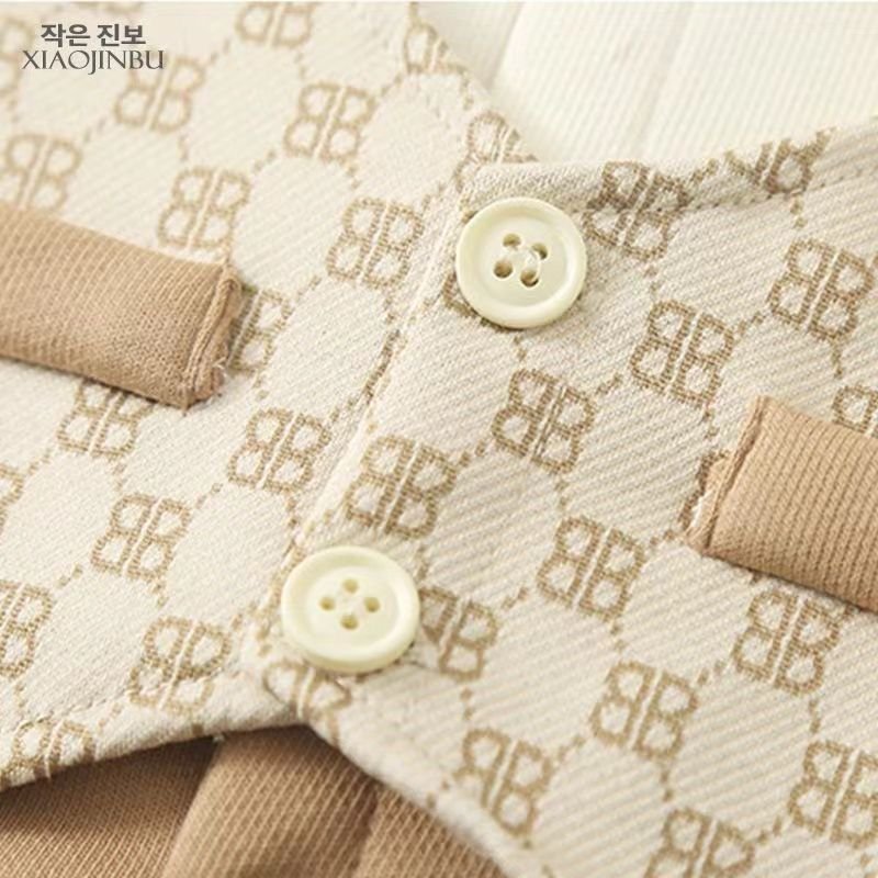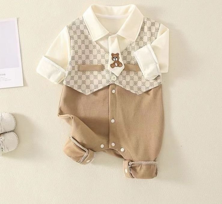 This charming baby romper is styled like a classic gentleman’s outfit, featuring a soft cream shirt with a printed waistcoat design in warm beige tones. The adorable teddy bear detail at the chest adds a playful touch, while the snap-button closure and rolled cuffs ensure comfort and easy dressing. Made from gentle, baby-friendly fabric, it’s perfect for special occasions, family gatherings, or stylish everyday wear