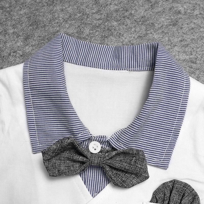 This classy 1-piece romper is designed like a tiny tuxedo . It features a striped short-sleeve shirt look, smart white vest detailing, cute bow tie, and snap-button bottom for easy changing. Perfect for birthdays, weddings, parties, or special photo moments—your baby will look like a true little gentleman