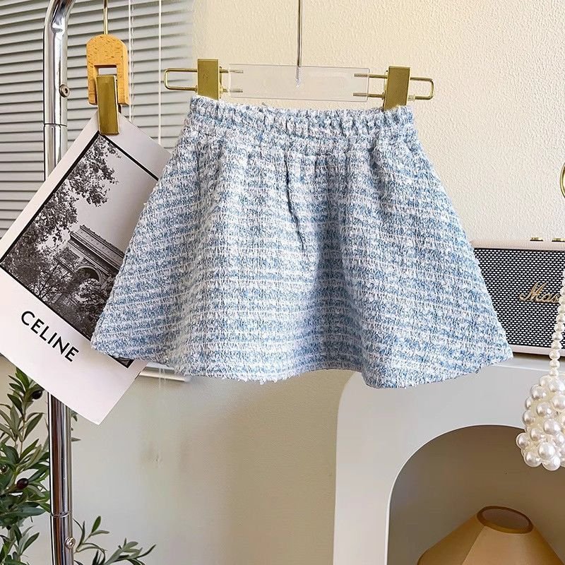 A classy two-piece outfit crafted in a soft blue tweed fabric, featuring a cropped jacket and a matching skirt. The jacket is detailed with elegant pearl buttons, a satin bow accent, and a delicate pearl neckline that adds a refined, vintage-inspired charm. The matching skirt completes the look with a graceful silhouette, making this outfit perfect for special occasions, parties, or a polished formal style.