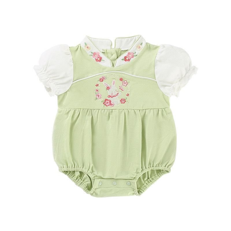 This adorable mint-green romper features soft puff sleeves and a delicate embroidered bunny surrounded by tiny floral details πΈπ. Designed with a gentle Mandarin-style neckline and snap-button closure at the bottom for easy diaper changes. Made from soft, breathable fabric to keep your little one comfy all day. Perfect for playtime, outings, or cute photos