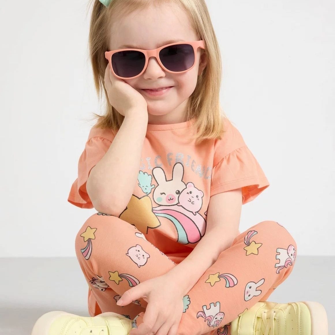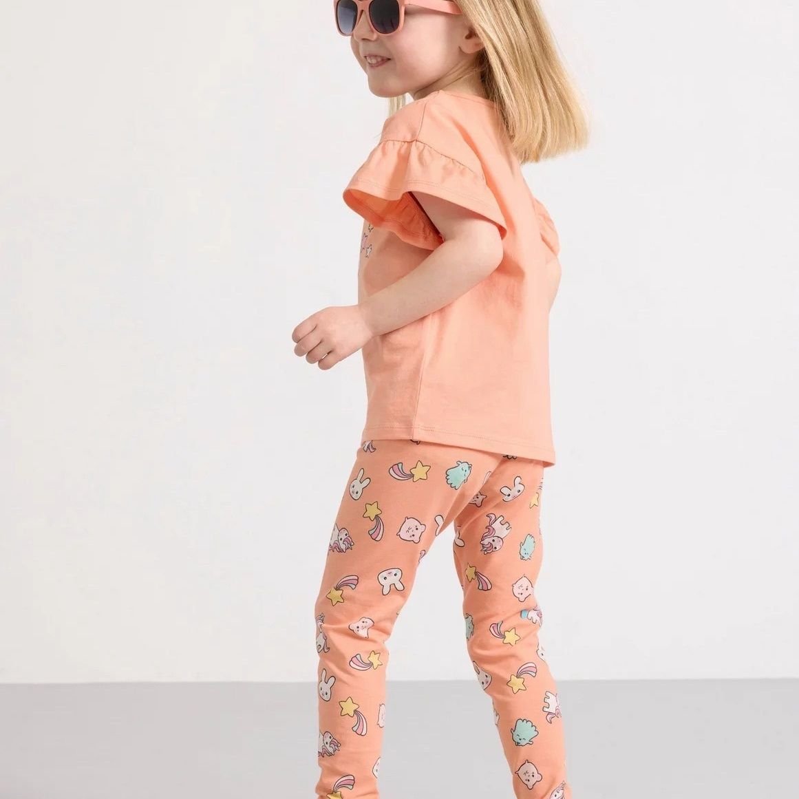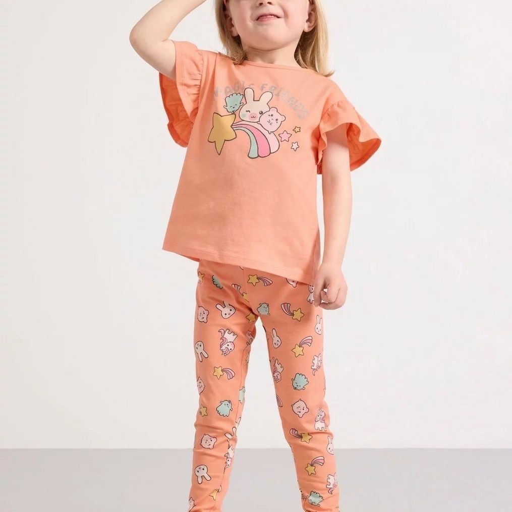 A soft and cozy peach-toned matching set featuring a flutter-sleeve tee with adorable cartoon friends riding a rainbow across the front, paired with printed leggings covered in stars, bunnies, and pastel characters. The warm peach color keeps it sweet while the playful graphics add a fun, dreamy vibe.