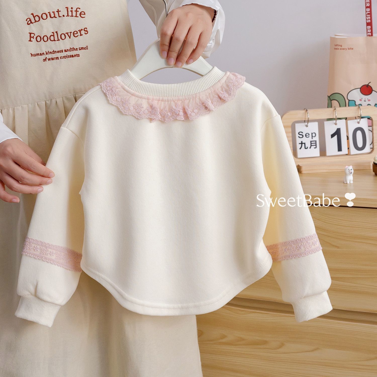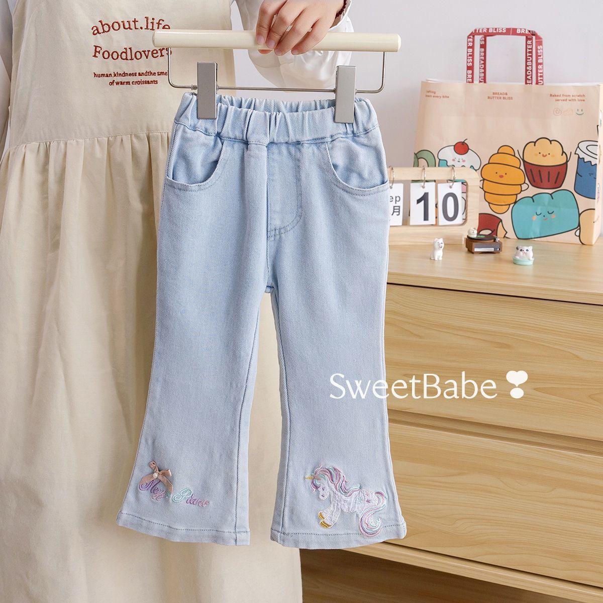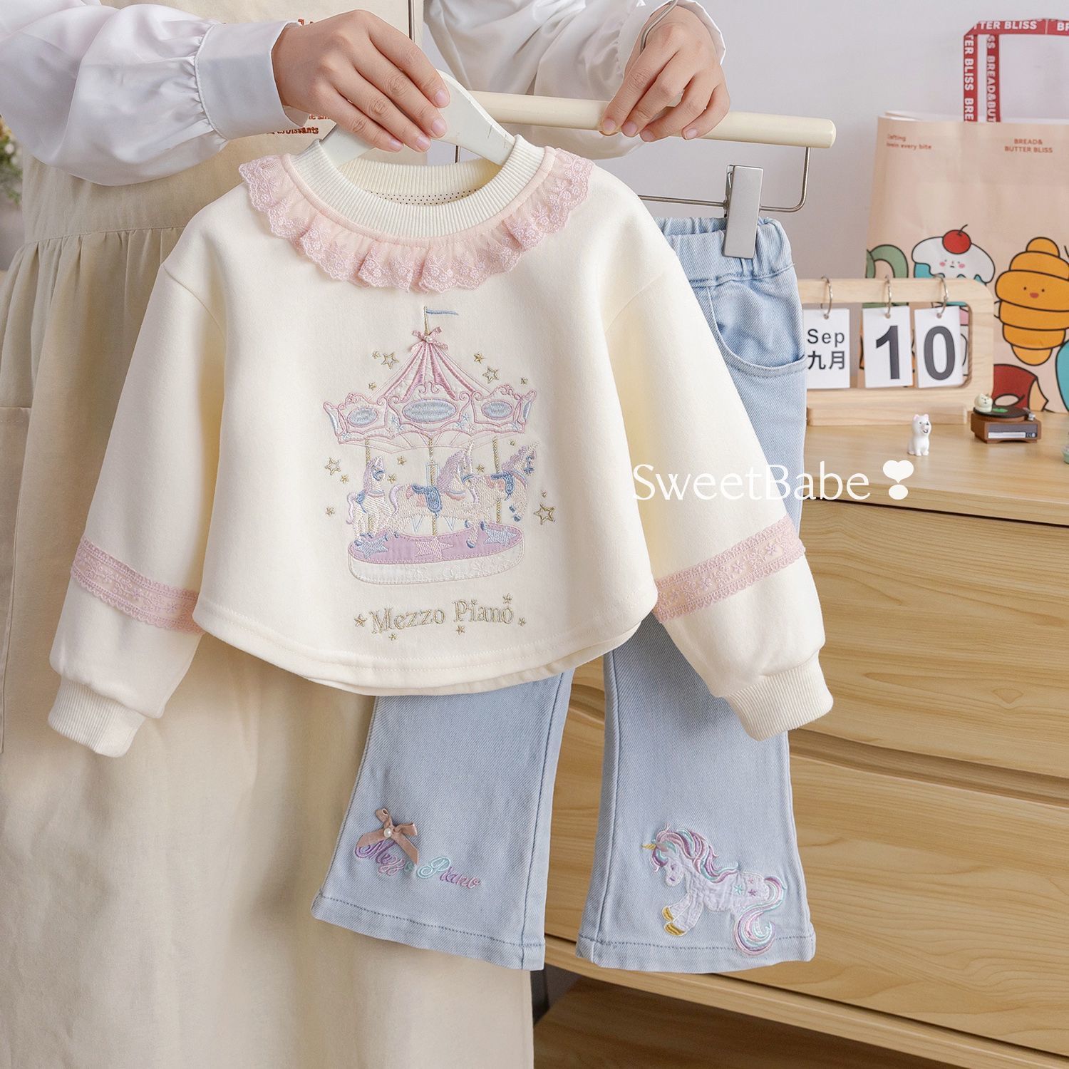 An adorable girls’ outfit set featuring a soft ivory sweatshirt paired with light blue denim-style pants. The sweatshirt is detailed with a delicate pink lace ruffle neckline and charming carousel embroidery, adding a fairytale touch. The matching pants come with cute embroidered accents and a comfortable elastic waistband for easy wear. Crafted from soft, cozy fabric, this outfit is perfect for casual outings, playdates, or special occasions, blending comfort with sweet, elegant style.