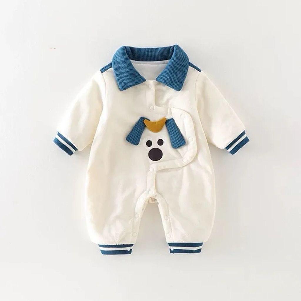 Dress your little one in effortless charm with this soft and stylish romper. Designed in a crisp white shade with a contrasting blue collar and sleeve trims, this romper features an adorable puppy face detail that adds a playful, lovable touch.