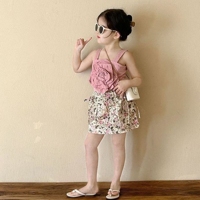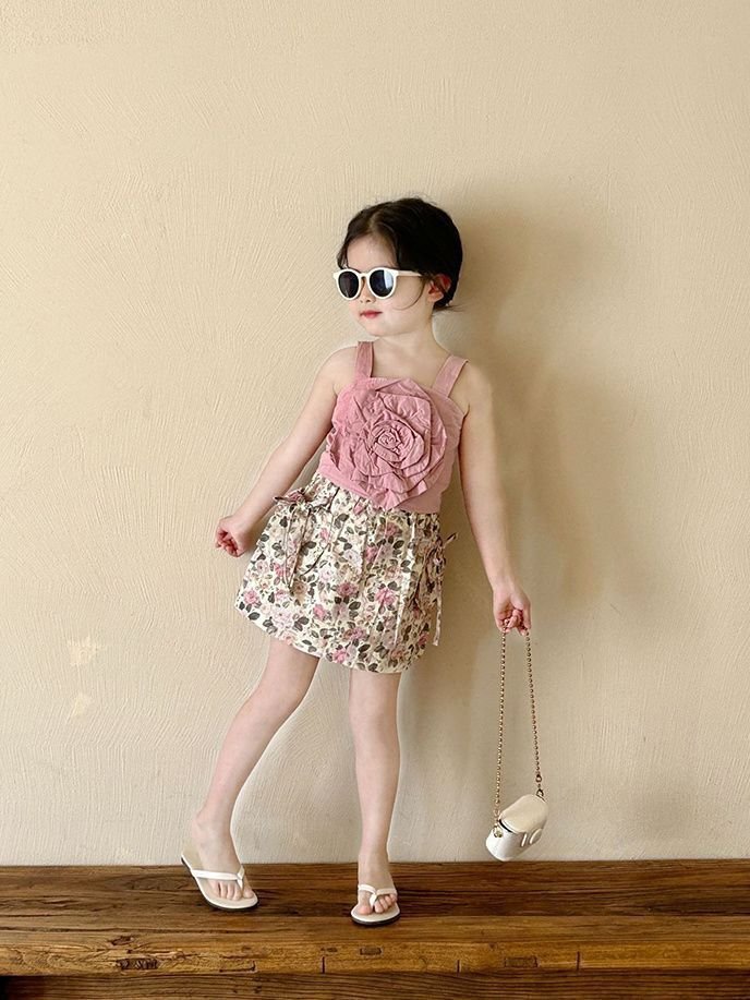The Rosy Bloom Summer Set is a charming and stylish outfit designed for little fashionistas The sleeveless pink top features a beautiful 3D rose flower detail on the front, adding a soft and elegant touch. It is paired with a floral printed skirt that brings a fresh, playful vibe perfect for sunny days