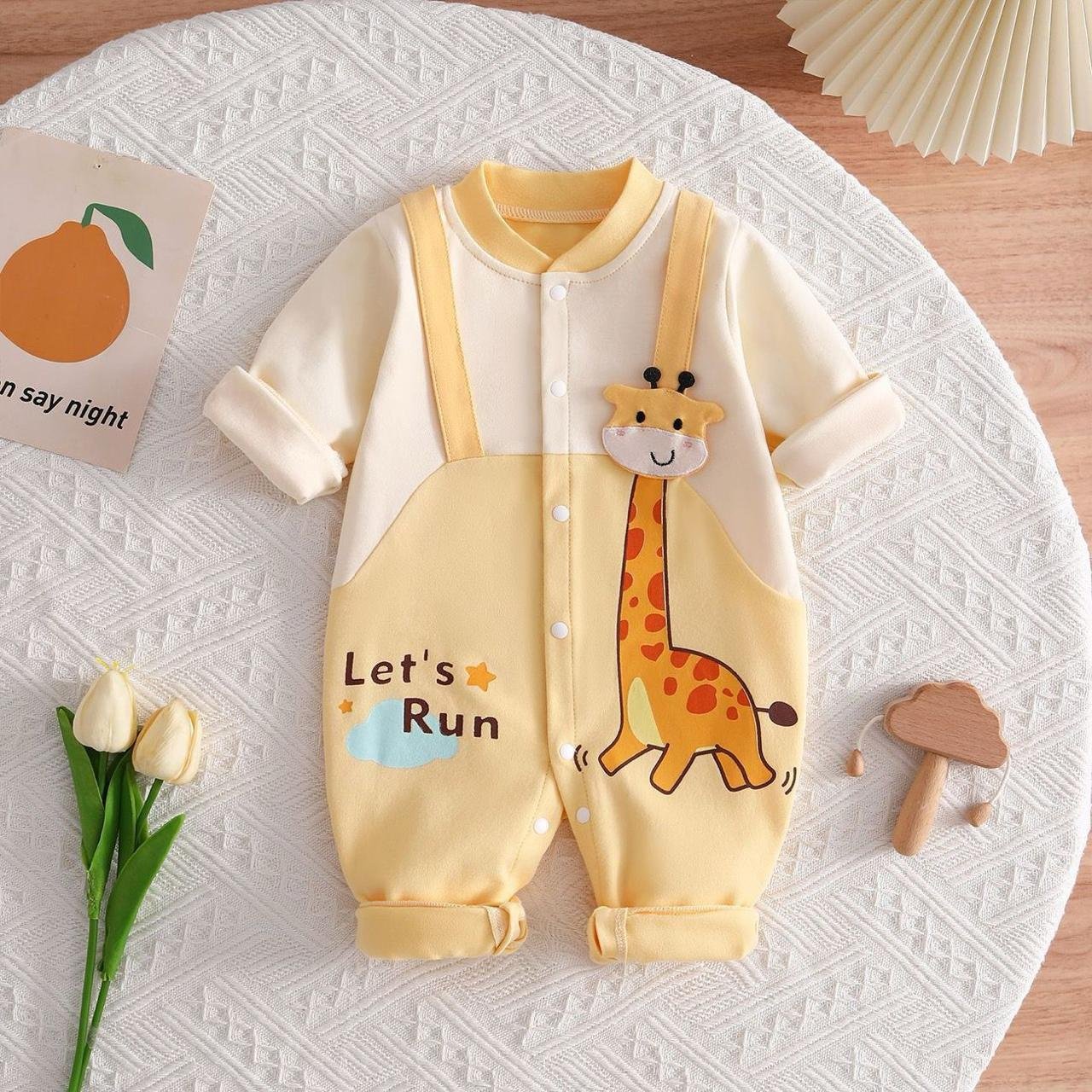 This adorable baby romper features a soft pastel yellow and cream color palette with a playful giraffe print that adds instant charm. Designed with a cute dungaree-style look, it includes snap-button closures for easy dressing and rolled cuffs for a cozy fit. The cheerful “Let’s Run” text and smiling giraffe detail make it perfect for everyday wear, photoshoots, or gifting. Made from gentle, baby-friendly fabric, this romper keeps little ones comfortable while looking irresistibly cute.