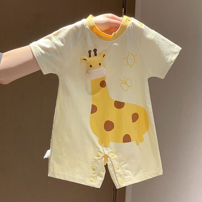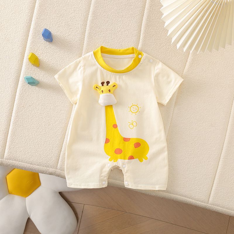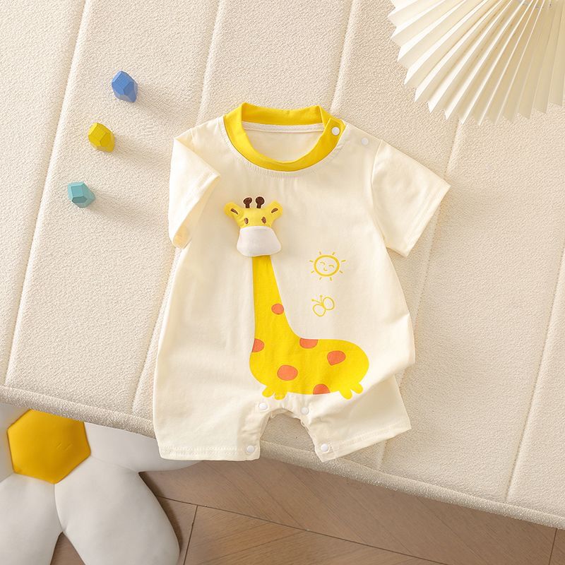 This adorable 1-piece romper PC set features a cheerful yellow giraffe print with a cute 3D giraffe detail on the front. Designed with soft cotton fabric, short sleeves, and snap buttons at the bottom for easy diaper changes. The bright yellow neckline adds a sunny, playful touch, making it perfect for daily wear, playtime, or gifting. Comfortable, breathable, and irresistibly cute