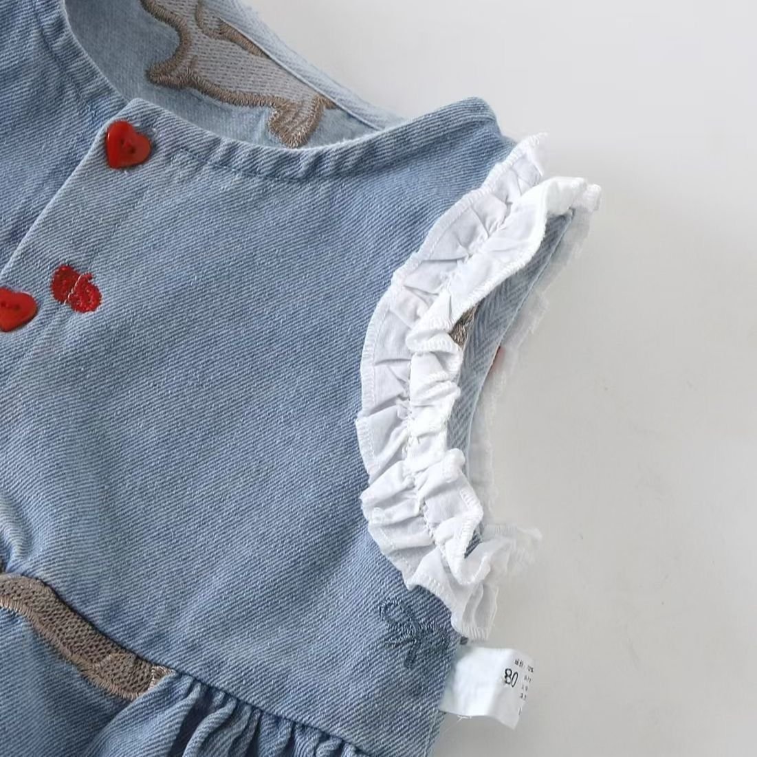 A charming two-piece outfit designed with soft comfort and playful elegance in mind. This set includes a crisp white long-sleeve blouse with a gentle ruffled neckline, layered under a light-wash denim peplum vest adorned with delicate embroidery and tiny red accent details. The matching wide-leg denim pants feature an elastic waistband for easy wear and a lace-trim hem for a sweet finishing touch. Perfect for everyday outings or special moments, this outfit blends cozy practicality with an adorable, vintage-inspired look.