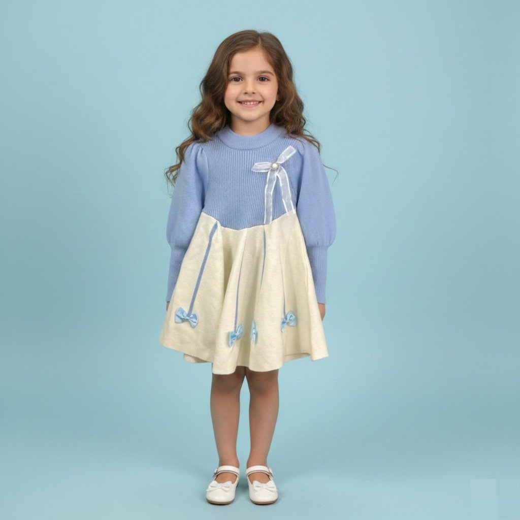 A charming and elegant dress in soft pastel tones. The top features a light blue ribbed long-sleeve bodice with gently puffed shoulders, creating a cozy yet refined look. The skirt is cream-colored with delicate vertical blue accents and small bow details, adding a playful touch. Finished with a sheer ribbon bow at the chest, this dress feels graceful and sweet—perfect for parties, celebrations, or special daytime outings.