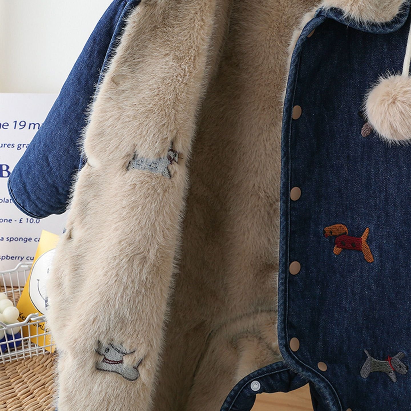The suit features a luxurious faux fur collar, cuffs, and leg openings, adding extra insulation and a stylish winter look. Cute embroidered teddy dog motifs are scattered across the outfit, giving it a playful and charming touch. Snap-button closures along the front and legs allow for easy dressing and diaper changes.